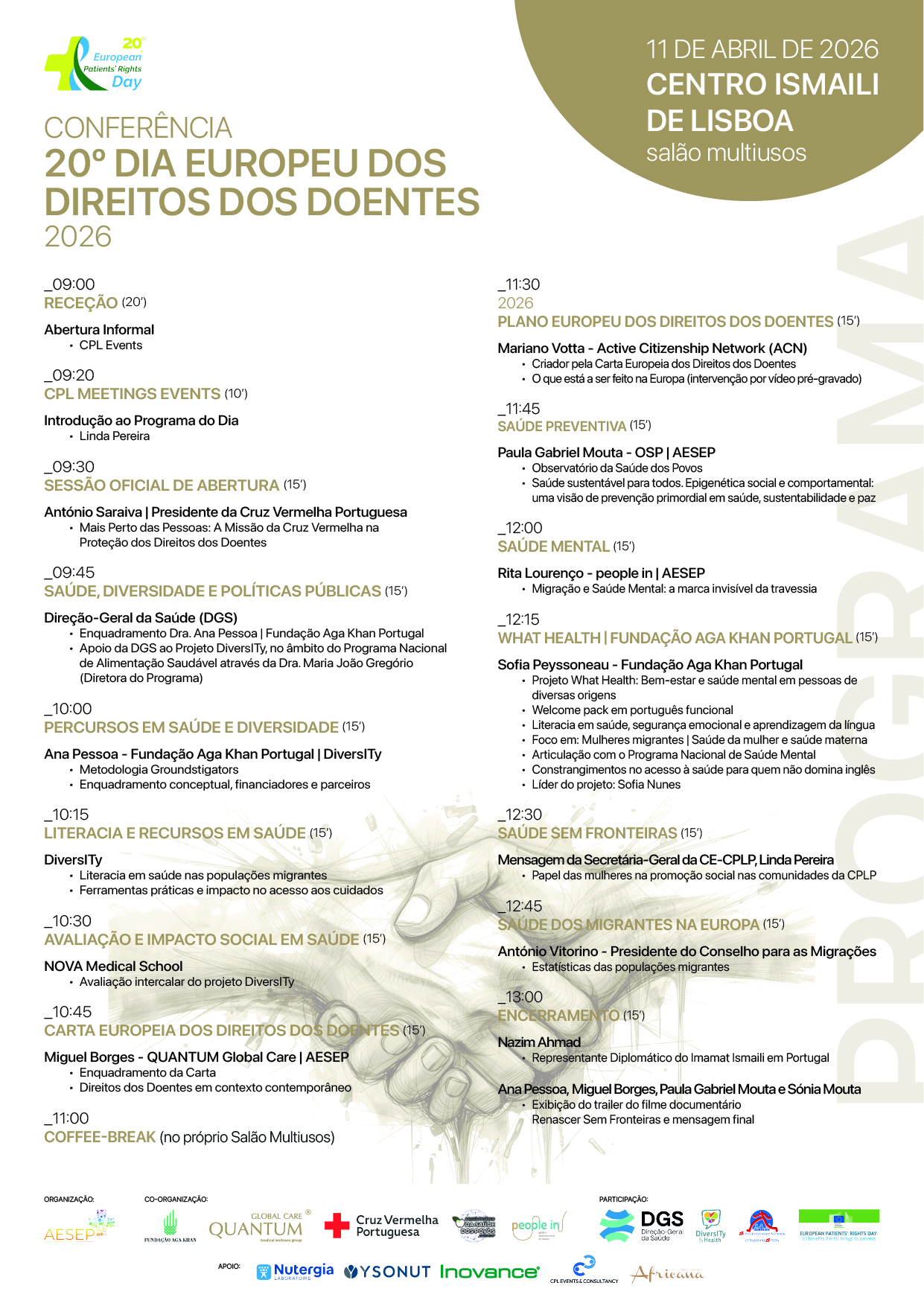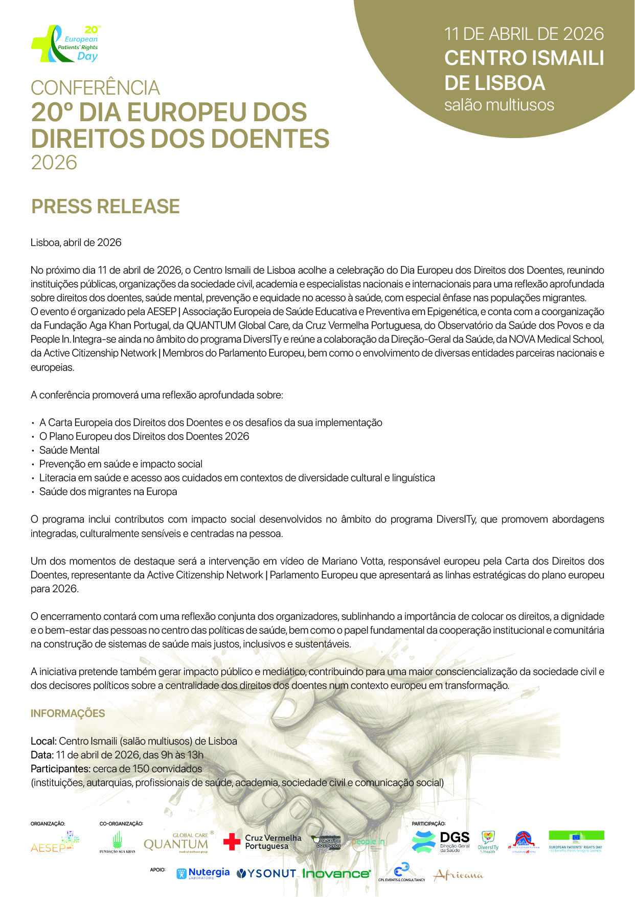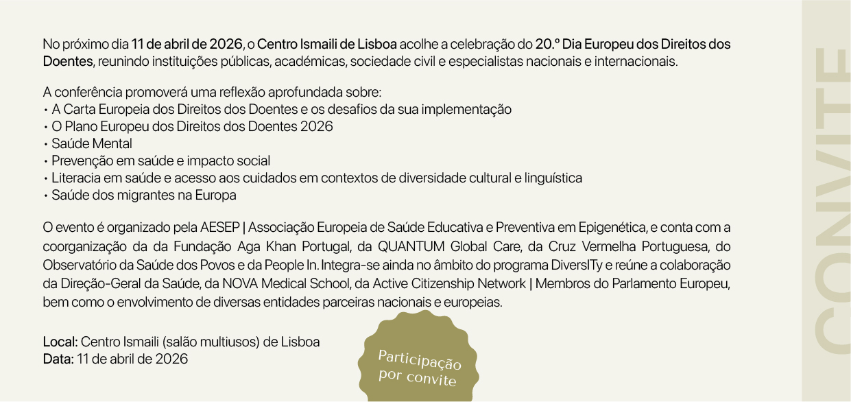 No próximo dia 11 de abril de 2026, o Centro Ismaili de Lisboa acolhe a celebração do Dia Europeu dos Direitos dos Doentes, reunindo instituições públicas, organizações da sociedade civil, academia e especialistas nacionais e internacionais para uma reflexão aprofundada sobre direitos dos doentes, saúde mental, prevenção e equidade no acesso à saúde, com especial ênfase nas populações migrantes.